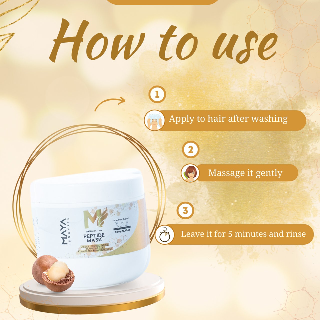 • Peptide mask , saturated with glycolic extract , Peptide mask from MAYA INNOVATE is an innovative solution with many benefits for the health of hair.