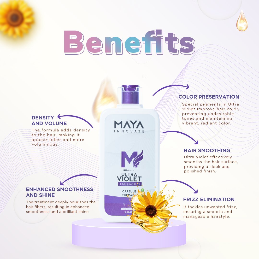Ultra Violet from MAYA INNOVATE is an exceptional hair care product specifically formulated for colored hair, designed to deliver optimal smoothing results while preserving the vibrancy of blonde or dyed colors. Its unique and innovative formula works powerfully to smooth the hair surface, add density, and eliminate unwanted frizz. By treating the hair fibers, Ultra Violet enhances smoothness, shine, and flexibility. Ultra Violet include moisturizing agents that deeply hydrate colored hair, ensuring it remains soft and manageable. Furthermore, cuticle sealers seal the hair cuticles, locking in moisture and color. This comes along with Color-Preserving Pigments that maintain the vibrancy of the hair color, preventing fading and undesirable tones. For optimal results and long-lasting stunning color, use Ultra Violet after the hair coloring process. This will help maintain the health, vibrancy, and smoothness of your colored hair.